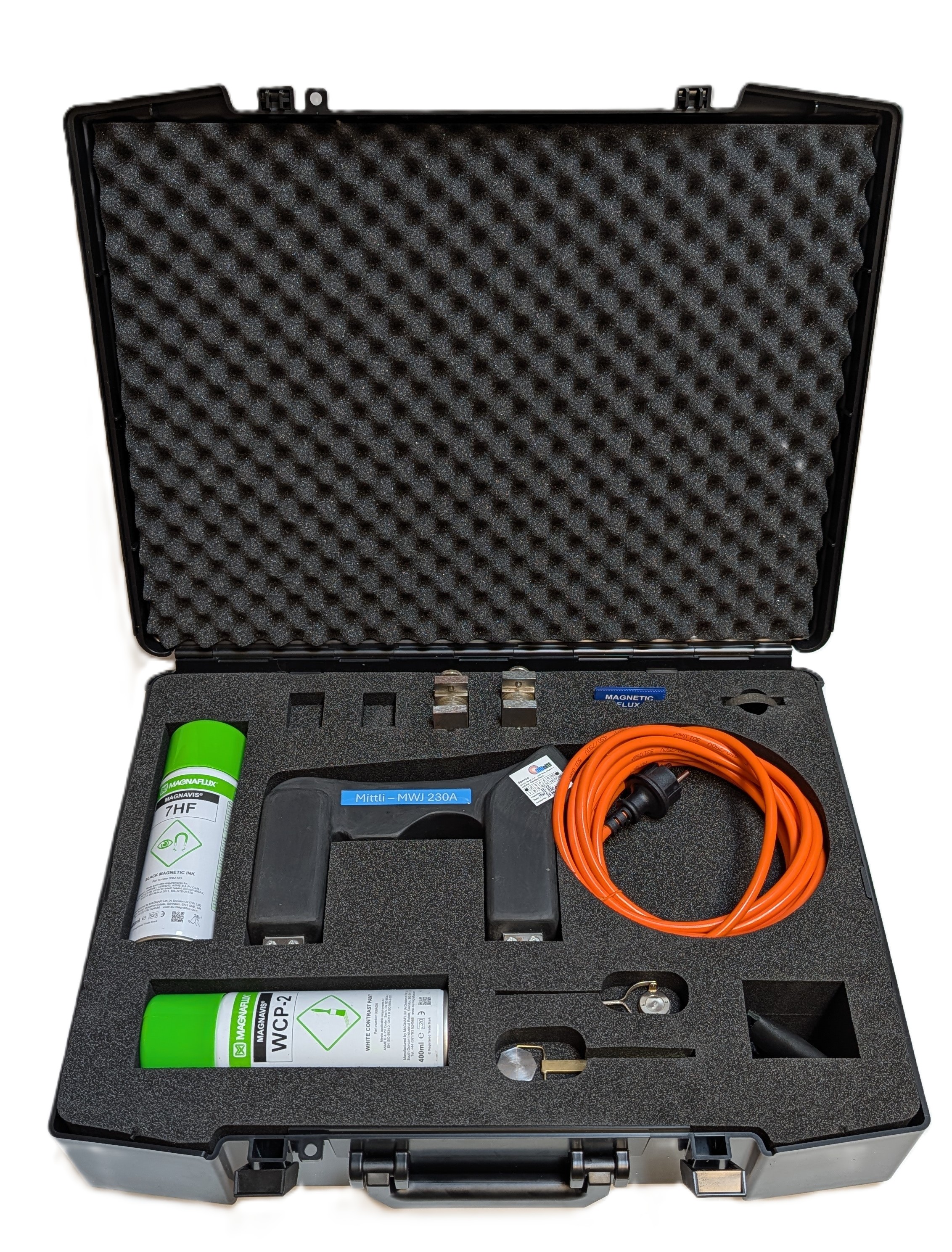 Ein robuster Transportkoffer mit perfekt angepasstem Inlay, in dem alles Wichtige für die mobile fluoreszierende Magnetpulverprüfung Platz findet.